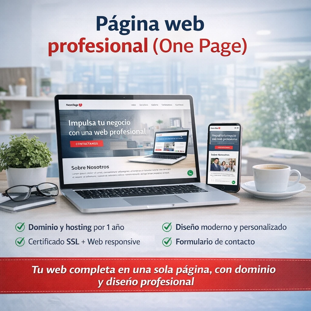 Página web profesional de una sola sección (One Page), con dominio propio, hosting por 1 año y diseño moderno. Ideal para emprendedores, profesionales o negocios que necesitan presencia digital completa sin un desarrollo costoso.